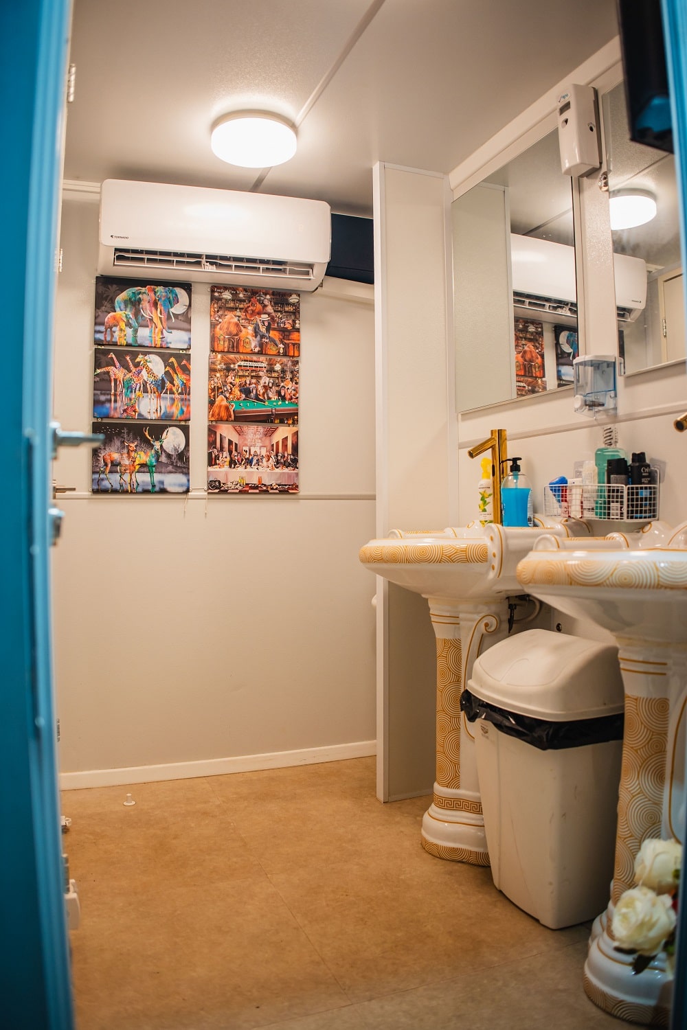 קרונות ממוזגים עם כיורי מים זורמים, מראות גדולות, תאורה נעימה ולעיתים גם מוזיקת רקע.